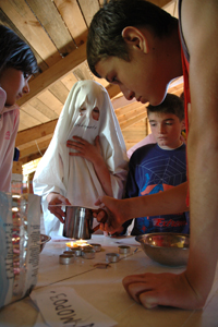 We had elephants, lions, giraffes, and zebras as our family groups. At the camp fire we had Theo’s huge clown shoes set on a table. Each child would have to come up and put their hands into the “sorting shoes” (ala Harry Potter’s sorting hat) and ask which family they would be in. After the shoes told them what family they would be in, the family heads of that respective family would come down and swoop the child into their family in some sort of ceremonious way. It was a wonderful way to introduce the children to their prospective families and the other family members, and a magical start to camp.