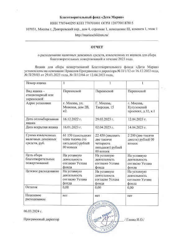 Отчёты за наличные из ящиков сбора пожертвований