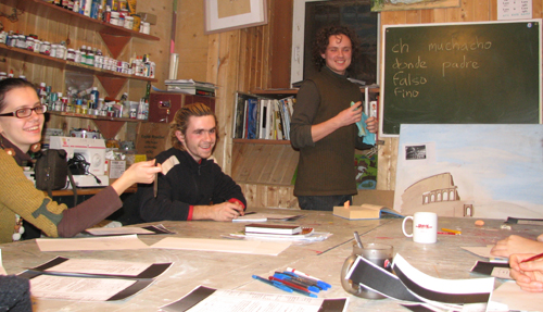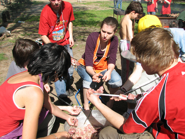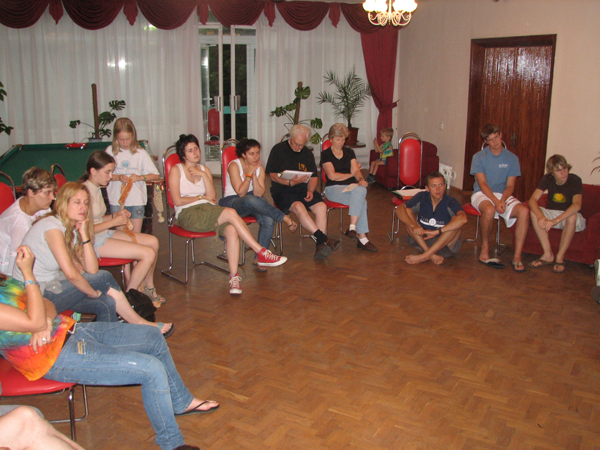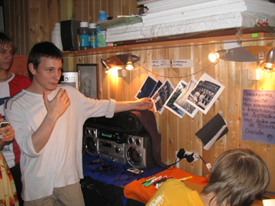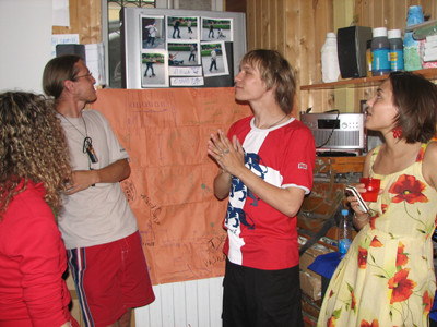 У нас проходит семинар по подготовке к лагерю. Мы в пансионате "Соловьиная роща". С нами старые друзья - Тео с дочкой, Чип, Наоми, Морган, Эрика Стеклер, Ира, Дженнифер и Павел. А также много новых волонтеров - Боб, Эрма, Джей, Аллистер, Нина, Лесли с тремя сыновьями. Мы перезнакомились и теперь обсуждаем планы лагеря. Завтра - на Селигер! А послезавтра к нам приедут дети. А пока - рисуем бэйджики, флаги, шьем хвосты, примеряем уши и говорим, говорим...