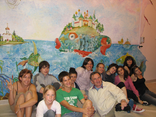 Сегодня вечером наша дружная команда начала расписывать стену в отделении травмы в больнице Св. Владимира, в которой сейчас лежит Надюшка Левенкова. На этот раз мы начали картину "Rainbow village". Пока мы красили, проходящие мимо врачи и посетители, выходящие из лифта, удивленно переглядывались или спрашивали, правда ли это пятый этаж? Еще мы открыли, что медицинские халаты идеально подходят для росписи стен, так как они почти полностью покрывают одежду. Картина еще не доделана, так что можно будет присоединиться к нам в наших последующих поездках. А потом нам, может быть, разрешат расписать и другую стену.