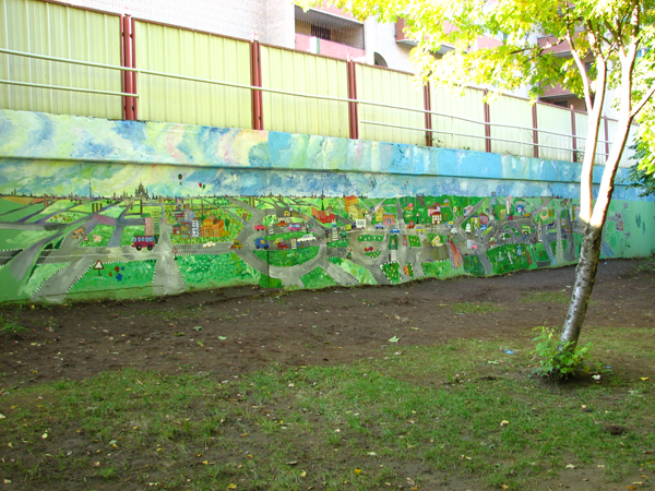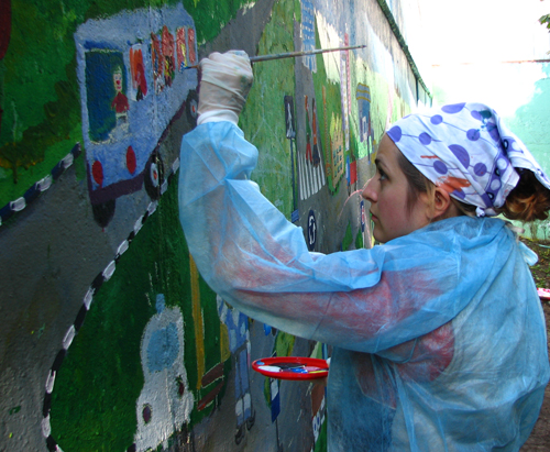 Юля: "Это мой первый опыт участия в росписи стен. Оказалось, очень веселое занятие. Приятно думать, что завтра кто-то из детей выйдет в холл и увидит, что вместо обычной гладкой стены появились замки на облаках и радуги, освещенные солнцем. И это будет маленькое чудо."