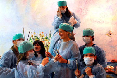 Мы продолжаем начатую неделю назад роспись стены в отделении радиологии. Точнее целых двух стен, так что работа еще не закончена, и Вы можете присоединиться к нам еще через неделю. На фото не бригада хирургов, это "врачеватели душ" - наши художники - Ася, Аня, Мария, Руслан, Сона, Эрика, Оксана, Наташа, Юля, Асланбек, Надя.
