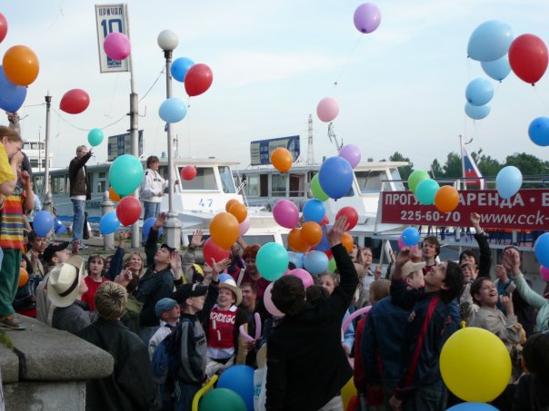 Мы плыли на речном трамвайчике до Бухты радости, слушали кубинских музыкантов, ели шашлык, танцевали, загорали, играли в "Картошку" и регби, рисовали. А, вернувшись на причал отпустили в небо шарики с заветными желаниями. В общем, день удался.