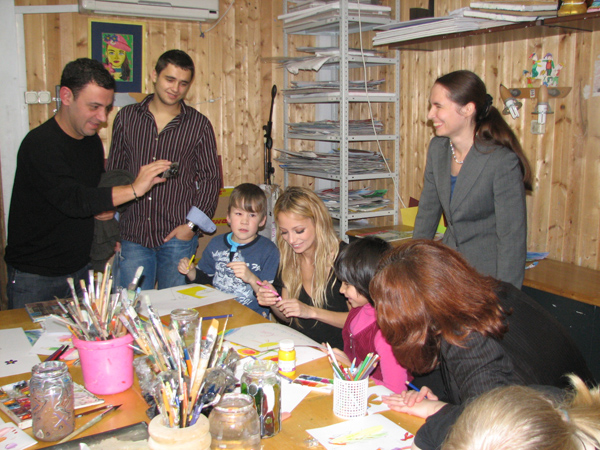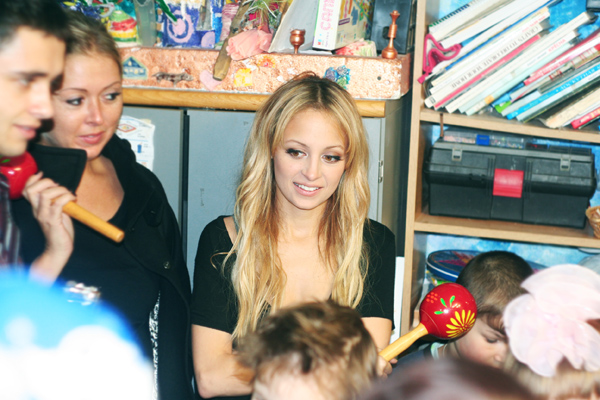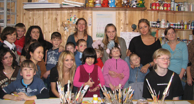 Николь знакомилась с ребятами из 4-го интерната и восхищалась их рисунками и поделками из глины. Мы показали гостье нашу студию и сыграли для нее "Калинку-малинку" в сопровождении шумового оркестра. Николь тоже немного поиграла и порисовала с нашими ребятами. Ребята с интересом узнали, что у Николь есть 11-месячная дочка. А на прощание мы подарили американской звезде глиняного жирафа.