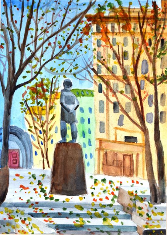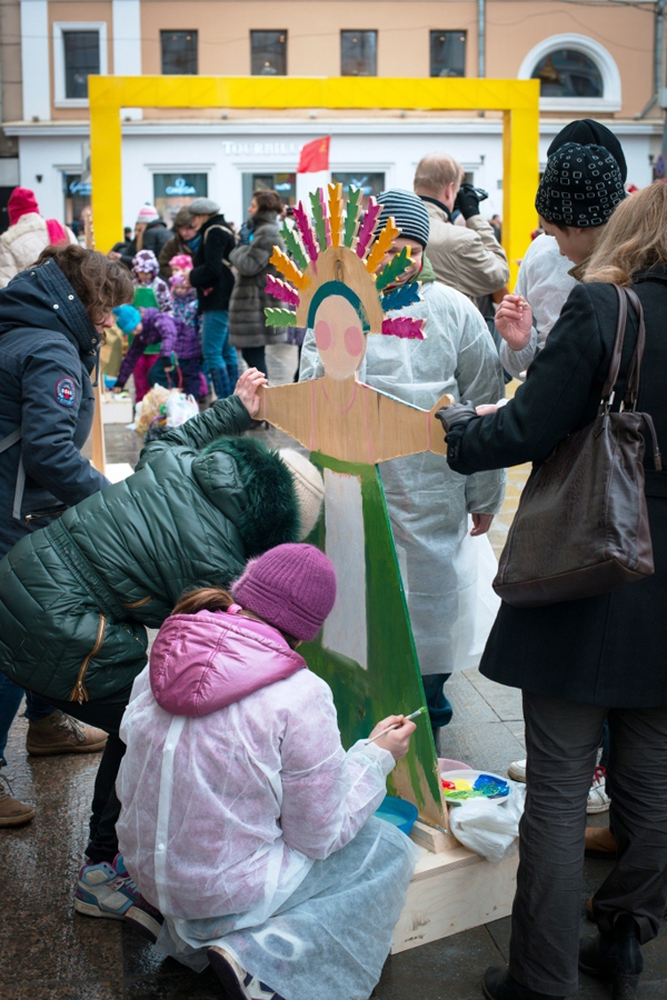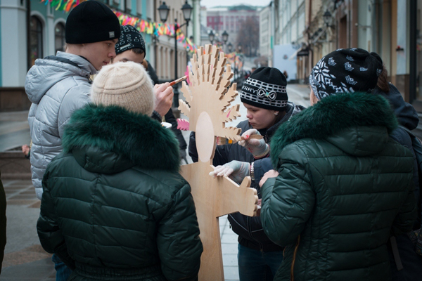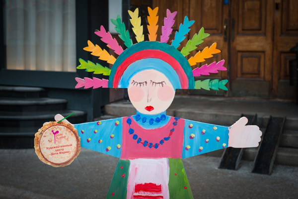В Столешниковом переулке появились 15 фигур из фанеры с изображением куклы-Масленицы. Нужно было раскрасить одну из них красками. Ребята из 7 «а» 4го интерната под вдохновляющим руководством нашей художницы Нюси Митиной придумали и создали вот такой образ.