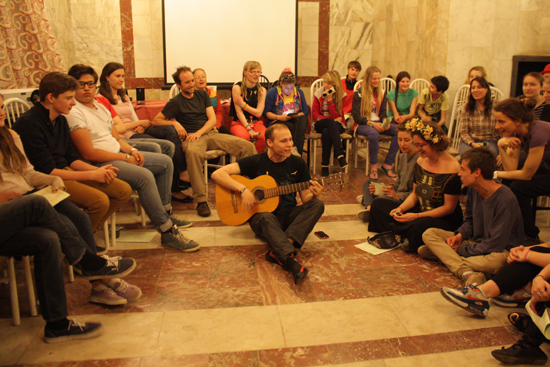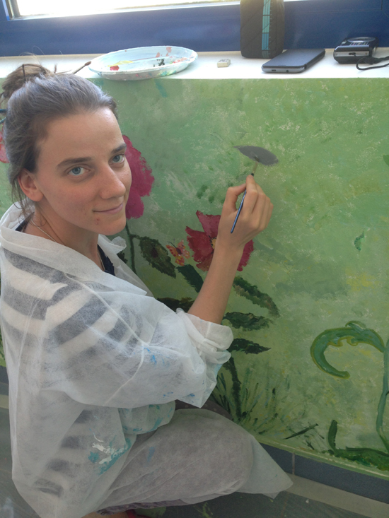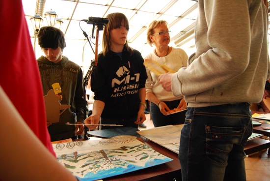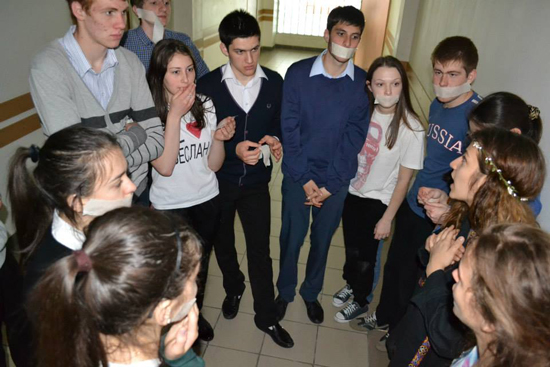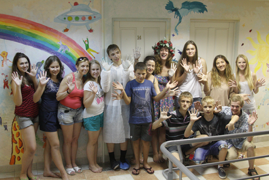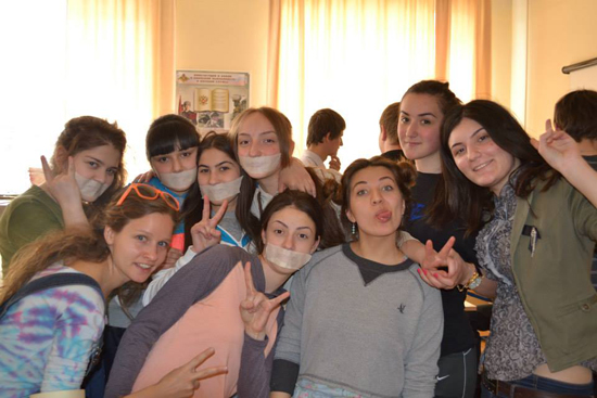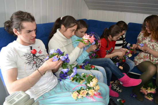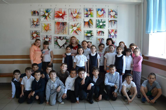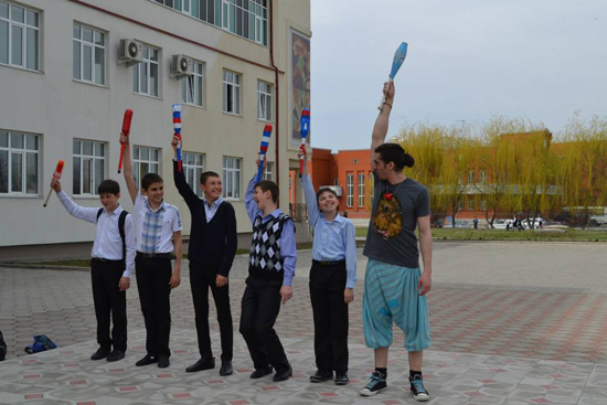 А на учебной неделе мы практически поселились в школе и проводили с утра до вечера разнообразные мастер-классы и расписывали стены в спортзале. Мария рисовала коллективную картину с первоклассниками, Ася и Жанна проводили тренинги на доверие со старшеклассниками, Эрика обучила старших девочек приёмам гримирования, и вместе они расписали лица школьников. А в это время Аня с одиннадцатиклассницами плели веночки в подарок любимым учительницам, третьеклассники с Соной открывали новые возможности восковыхмелков, которые под воздействием горячего ветра превращались в красочные абстракции… Гийом инициировал жонглёрский клуб, и дети начали с создания булав своими руками из подручных средств (пластиковые бутылки, старые теннисные мячи). Тема «утилизации отходов» в предметы искусства и вдохновения прозвучала и в спортзале, где Оля с Маграт из страниц старых газет и журналов придумали построить с детьми башню. С младшими классами Тэо играл в клоунские игры и занимался клоунадой. А Кристина с пятиклассниками делали мультфильм и театральный тренинг. По традиции в предпоследний день волонтёры и школьники устроили концерт друг для друга, а потом поехали вместе к детям в детский дом «Хуры Тын» во Владикавказ.