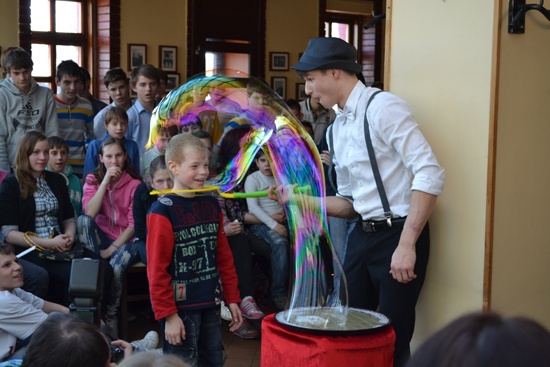 Потом дети увидели Шоу мыльных пузырей, и некоторым даже удалось попасть внутрь огромного мыльного пузыря!