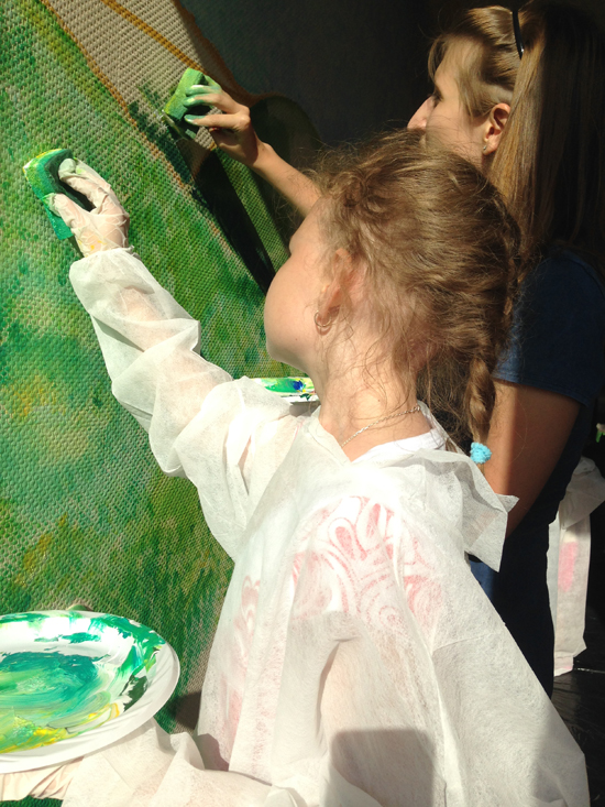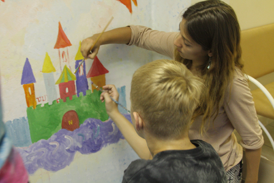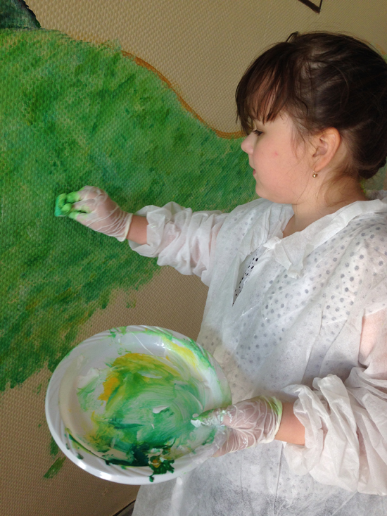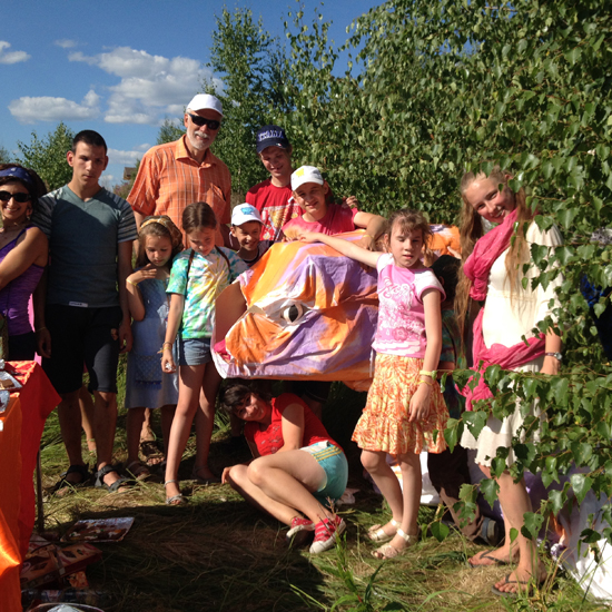 Мы снова побывали у своих друзей в Лечебно-реабилитационном научном центре «Русское поле» — четыре дня расписывали стену. Участие принимали не только дети, но и их мамы! А в воскресенье Александр Колмановский поставил с детьми спектакль «Золотая рыбка». Это был чудесный «театр с колёс»!