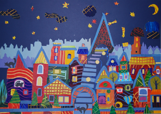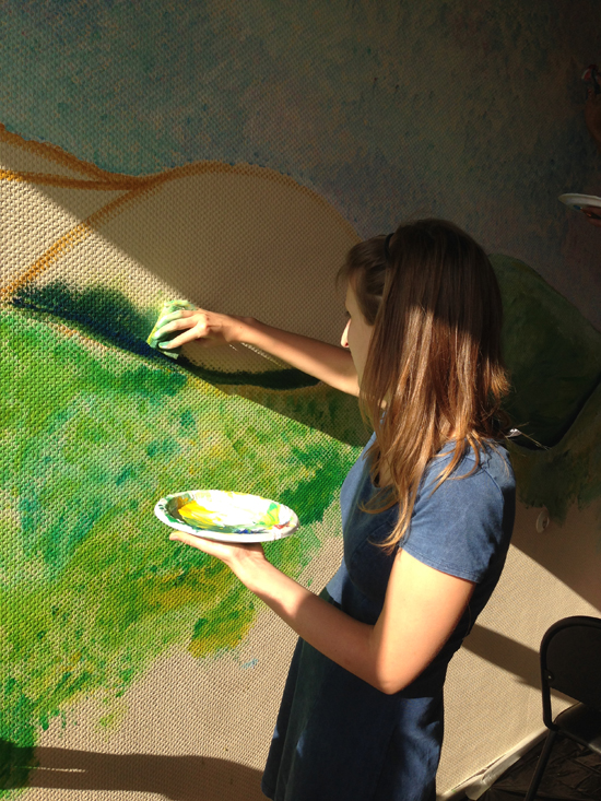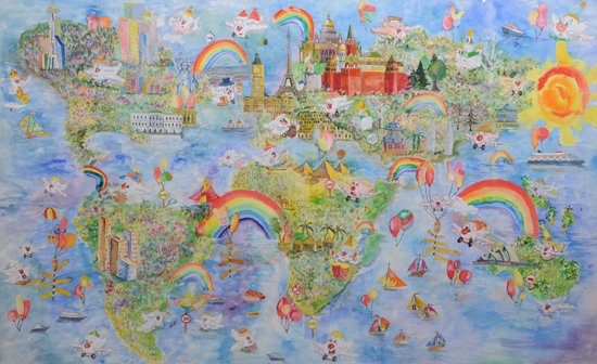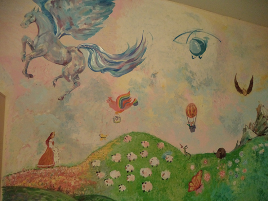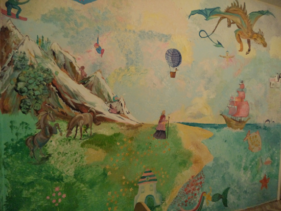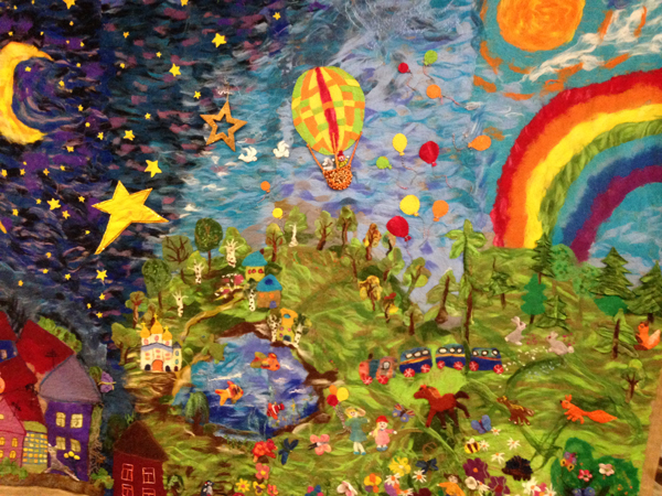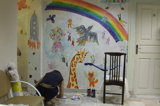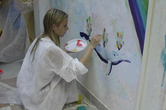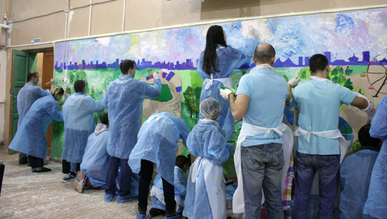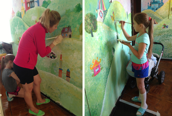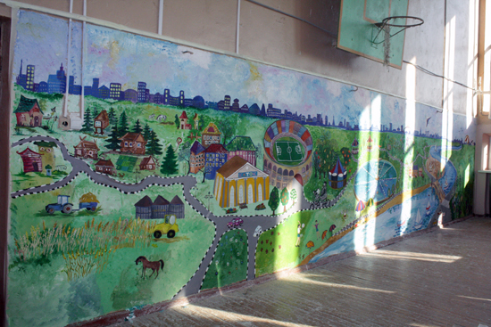 Благодаря мастерству наших художников Анны, Нюси, Соны и помощи всех детей и взрослых во всю длину стены появилась картина, на которой есть и город, и деревня, и прекрасные сады, и много спортивных сооружений — ведь картина находится в спортзале. Персонажи на ней бегают, плавают, играют в волейбол, катаются на велосипедах и лошадях, и даже летают на дельтаплане и парашюте. Картину рисовали до поздней ночи, а на другое утро еще заканчивали.