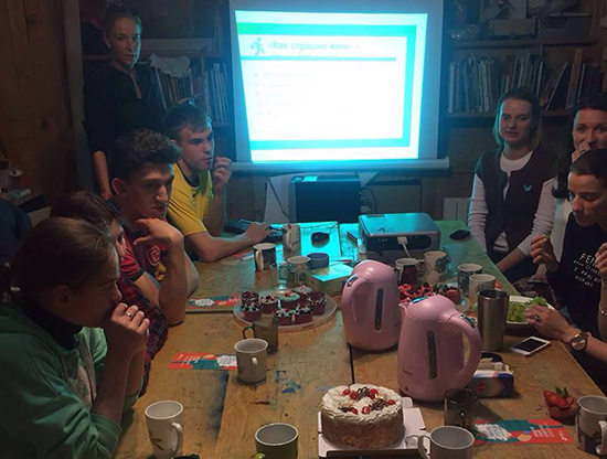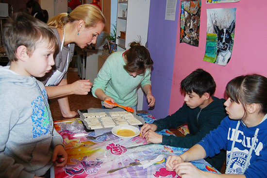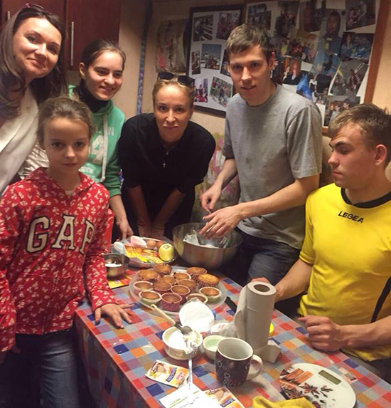 13 апреля к выпускникам интернатов в студию на Дмитровке пришли волонтеры из компании «Сбербанк Страхование». Первая часть вечера — совместное приготовление капкейков. Ребята и гости разделились на две команды и приготовили много мини-тортиков, используя ягоды для украшения.