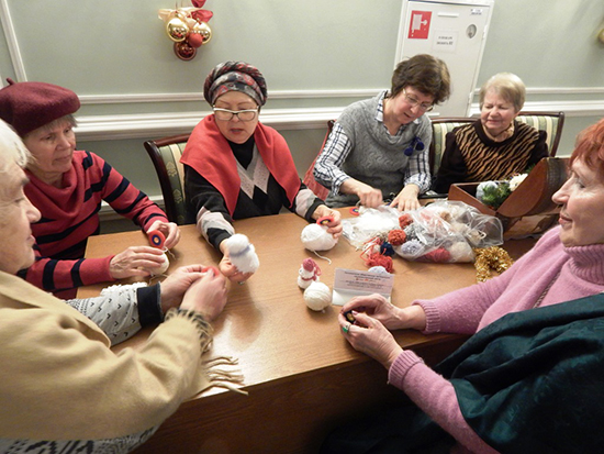 19 декабря «Дети Марии» участвовали в новогоднем празднике Центра социального обслуживания Тверского района. Мы проводили мастер-класс — делали новогодние сувениры из пряжи. Гостьи праздника — пенсионеры района — с увлечением накручивали помпончики, делали из них петушка, снеговика, пушистые шарики.