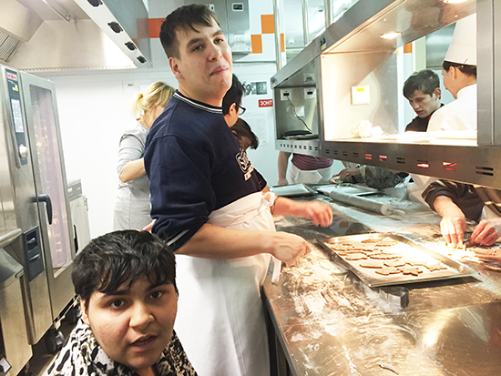 19 и 20 декабря наши ребята побывали на предновогоднем кулинарном мастер-классе в Марриотт Отеле на Новом Арбате. В понедельник — дети из ЦССВ «Спутник», во вторник — молодежь из ПНИ № 16. Ребята вырезали формочками новогоднее печенье, а пока оно пеклось, кондитер Ирина провела нам экскурсию по кондитерскому цеху ресторана, это было впечатляюще — сколько хитрых приспособлений, оказывается, используют настоящие кондитеры!