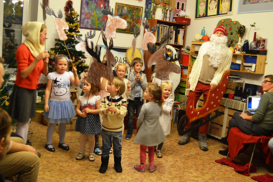 24 декабря в студии прошёл праздник для малышей из окрестных домов и детей и внуков сотрудников и волонтёров. К нам в гости приехали актёры из Творческого центра «Среда» с программой «Бродячий театр».
