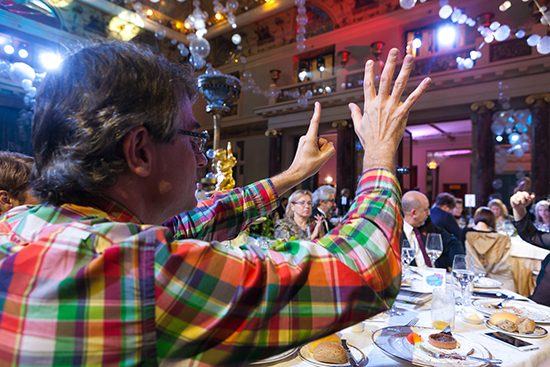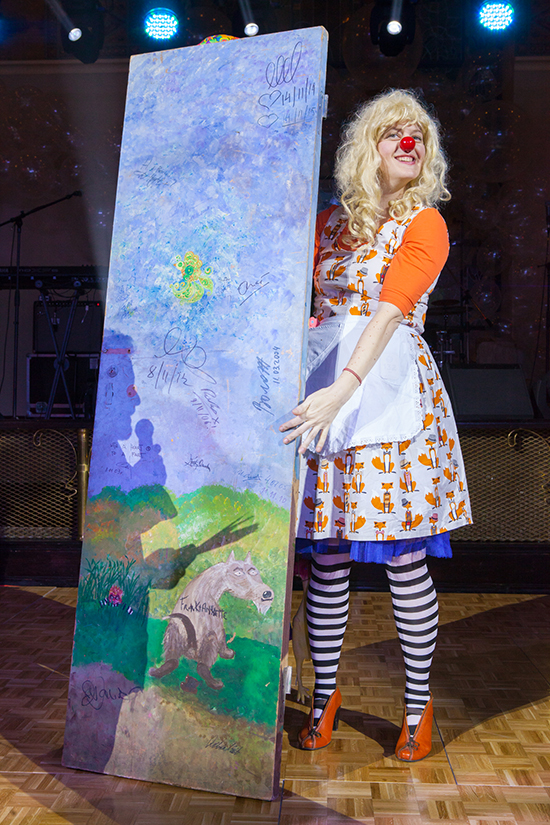 Эту часть вечера вёл знаменитый доктор-клоун Пэтч Адамс – давний друг студии «Дети Марии», основоположник смехотерапии и больничной клоунады, а переводил его речь популярный ведущий и учёный Илья Колмановский. Лот, который вызвал наибольший ажиотаж и принёс студии самую большую сумму, – мозаичные фигуры Алисы и Кролика, сделанные детьми из интернатов в летнем лагере «Детей Марии» с художницей Викторией Басиной.