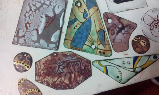 Мы придумали рисунки и перенесли их на предварительно очищенные ошкуренные и обожженные в печи медные пластины, потом нанесли на них эмаль, и снова обожгли в печи.
