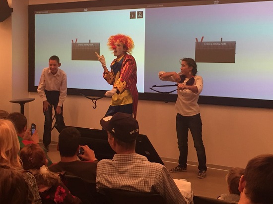 Завязкой и развязкой квеста была помощь клоуну, который пришёл порадовать детей, но по дороге растерял свой реквизит. Получив свои нос и ботинок, клоун устроил на сцене представление, в котором смогли поучаствовать и наши дети. Так мы открыли для себя незаурядный артистический дар Зухры!