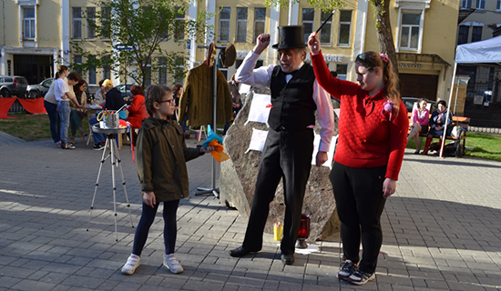 Звуки аккордеона, как машина времени, перенесли нас в послевоенный московский двор. Дети и взрослые читали стихи о войне, пели песни, были и пляски, и даже фокусник.