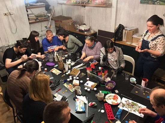 Художница Валентина Фаттахова провела для нас мастер-класс по изготовлению украшений из эпоксидной смолы. Заливали смолой засушенные цветы и листья, а в перспективе, как рассказала Валентина, заливать можно что угодно! Процесс выглядел волшебно, а желающих попробовать всё прибывало.