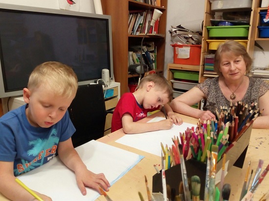 Наши преподаватели провели для ребят занятие. Малыши очень активные, любопытные, сначала осмотрелись, познакомились со всеми, расспросили, что у нас и для чего, а потом и порисовали, и с глиной немного познакомились, и песни пели. Уходя сказали: «Нам у вас очень понравилось!» Рисунки пришлось наскоро сушить феном, чтобы забрать с собой.