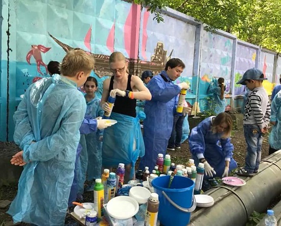 Весь июнь художники и волонтёры нашего фонда Пеликан расписывали забор во дворе НИИ педиатрии на Талдомской улице. Роспись профинансирована фондом «Абсолют-помощь».