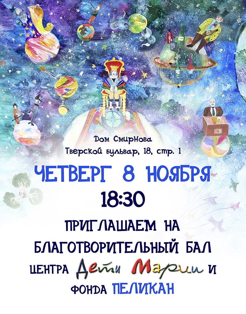 8 ноября в великолепных исторических залах особняка «Дом Смирнова» на Тверском бульваре прошел Ежегодный благотворительный бал Художественного центра «Дети Марии» и Благотворительного фонда «Пеликан». В программе вечера был изысканный ужин, выступления детей с танцевальными номерами, живая музыка, благотворительный громкий и тихий аукцион работ студийцев, розыгрыш призов, ярмарка сувениров, танцы.