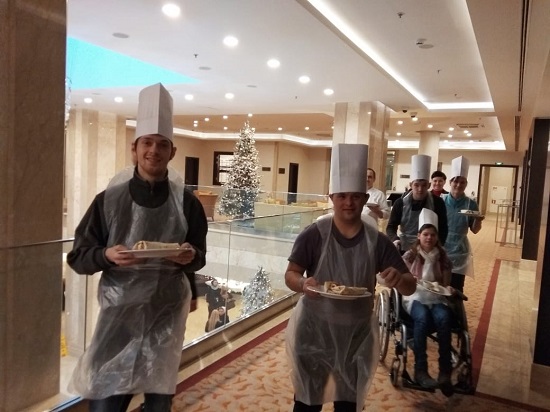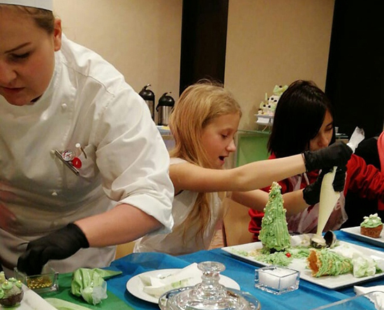 А 26 декабря отель пригласил детей из ЦССВ «Спутник». Под руководством поваров из ресторана отеля ребята приготовили сладкие десерты в виде новогодних ёлочек. И чаепитие было, и кино, и подарки!