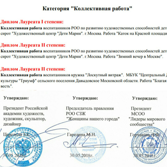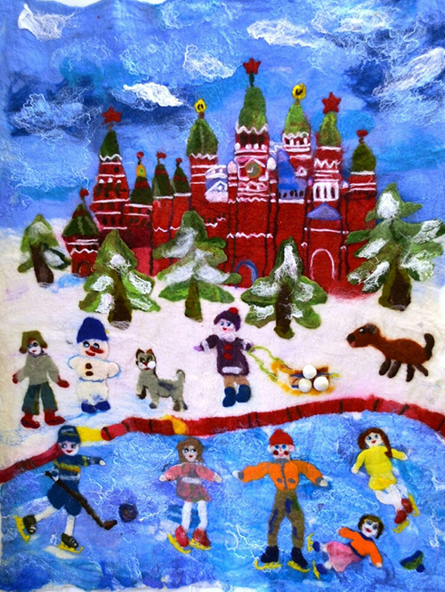 Жюри III международного Фестиваля-конкурса изобразительного искусства «Дадим шар земной детям» присудило Дипломы лауреатов 1 и 2 степени работам наших ребят «Каток на Красной площади» (коллективное валяное панно) и «Зимний вечер в Москве» (коллективная картина).