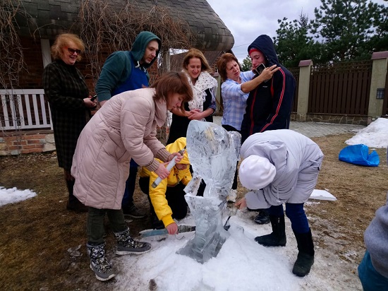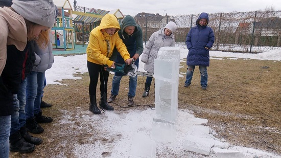 На глазах у ребят, Александр вырезал настоящую скульптуру из цельного и прозрачного куска льда! При этом, ребята тоже смогли поучаствовать в процессе.