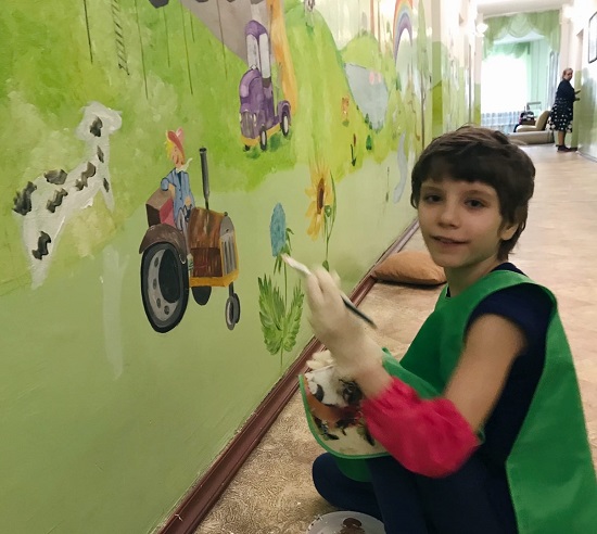 С нами рисовали все младшие ребята, ведь так интересно и здорово менять самим интерьер дома, где живёшь, и видеть, как преображается пространство вокруг, как из гладкой стены создаётся целый яркий и радостный мир — облака, кошки, коза, собака, дома и паровозы. Программа росписей стен в детских домах и больницах проходит при поддержке Фонда Президентских грантов.
