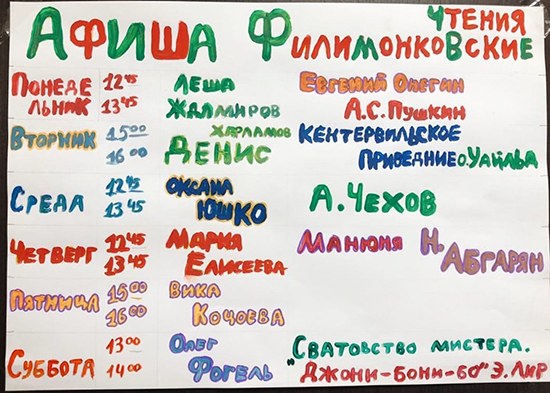 Сейчас, когда все скучают друг по другу на карантине, мы стараемся поддерживать связь с ребятами из интернатов. Общаться, узнавать новое и интересное очень важно всем — и взрослым, и детям. Так появился проект «Филимонковские чтения» — литературные встречи по видеосвязи с детьми из Филимонковского детского дома. Проект задуман нашей сотрудницей Софьей Дьяковой и воплотился в жизнь благодаря поддержке Марии Елисеевой и сотрудников Филимонок. Каждый день дети собираются вместе у экрана, видят лица друзей, а потом начинается история...