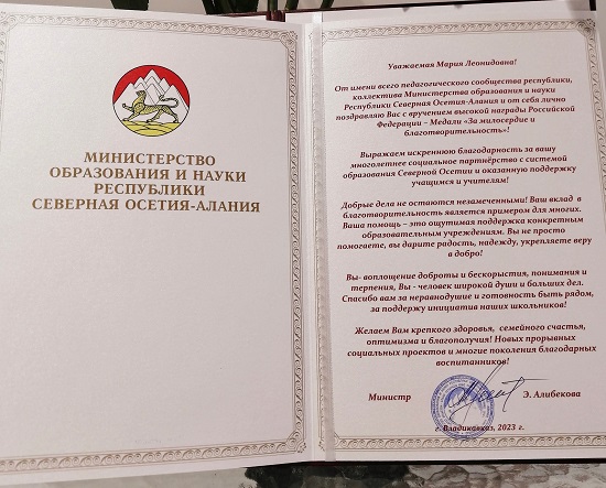 Из письма: «Выражаем искреннюю благодарность за многолетнее социальное партнерство в системе образования Северной Осетии, за оказанную поддержку учащимся и учителям. Вы не просто помогаете, вы дарите радость, надежду, укрепляете веру в добро!»