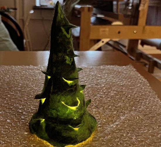 А еще, если внутрь наших ёлочек поместить гирлянду или электрический фонарик, получится уютное тёплое украшение для дома.