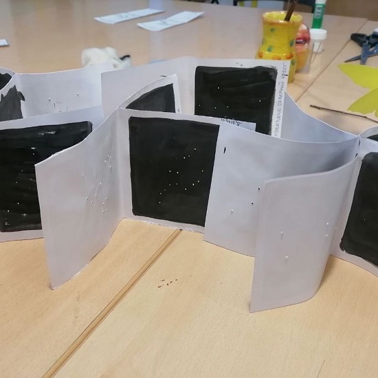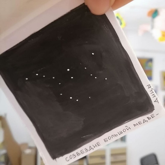 Сначала мы познакомились с созвездием Большой Медведицы, нашли на небе Северный Крест и многие другие группы звёзд. А потом приступили к работе. Каждый смог выбрать себе созвездие, нанести его на бумагу и оформить.