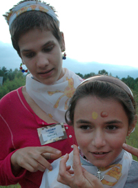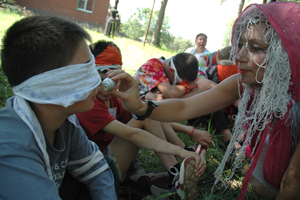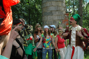 Было 8 групп по 8 человек. Каждую группу вел ЛЕПРИКОН — некий сказочный персонаж, ведущий, который знает маршрут. Народ леприконов, по легенде, потерял память, ее украли злые гоблины. Леприконов найти оказалось очень трудно, мы их нашли в последний момент, наконец все благополучно разделились. Детей мы поделили заранее, примерно в равной пропорции бесланцев и интернатских в каждой команде. Конечно, при делении пришлось учитывать всякие детские симпатии — антипатии, возраст и т.д. С каждой группой было 2-3 взрослых — леприкон и кто-то еще — воспитатель или педагог.