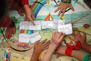 И еще один малыш Ванечка был после первого класса, но он тоже писать почти не умеет, он только читал по слогам, ему писали печатными буквами. Для многих детей это первый опыт — самому написать о событиях своей жизни, себе же на память. Чтобы не слушать по много раз похожие тексты: «Мне сегодня понравилось кататься на банане, купаться и есть хлопья», мы долго думали, как это можно разнообразить и случайно придумали следующее: каждый говорит только три слова, как можно точнее отражающие впечатление от прожитого дня. Это могло быть не только: купаться, лодка, банан, но и, например: вдохновение, дети, улыбки. Это оказалась такая новая игра, которая всем понравилась.